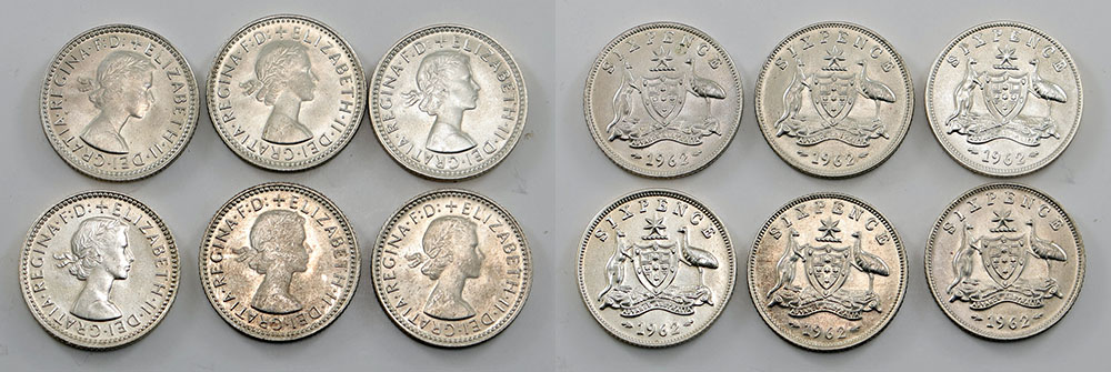 1962. Light tone with bloom. (6 coins total).
