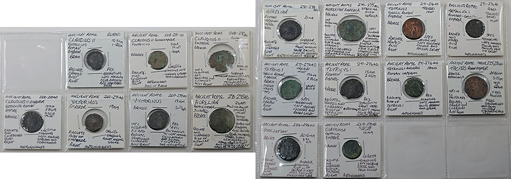 | Description: Ancient Rome Imperial bronze minors. Includes Claudius II (268-270AD) 5 varieties, Victorinus (264-271AD) Antoninianus (2), Aurelian (270-275AD) 3 varieties, Metrics (2710274AD) 6 varieties and Diocletian (284-294AD). A couple cleaned, otherwise toned and mostly crude, pitted. (17 coins total). G-VG |