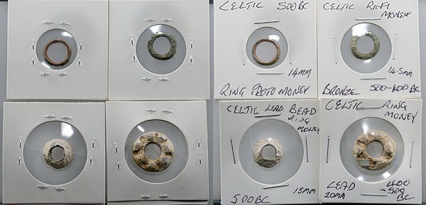 | Description: Ancient Celtic proto-money (c500BC); bronze rings: thin 14mm, thick 14.5mm, lead bead plain 15mm and indented 20mm. Celtic ring and bead money dates from approximately 800 to 50 BC, when these sturdy gold, silver, bronze and lead rings were traded as currency among the Celtic tribes from the Danube River region to Eastern Europe, France and Spain. And later, sometimes Britain, Wales, Scotland and Ireland. Scarce. (4 items total). G/VG |