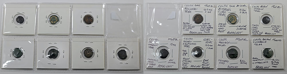 | Description: Ancient Celtic Gaul tribal bronze pontin units, 1st century BC: Aulerci Eburovices tribe (60-50BC) stylised bust/boar, unidentified helmeted head/bull, Cunobelinus tribe bare head/bull, Bellovaci tribe bearded head/rooster, Biturges Cubes tribe (80-50BC) stylised celtic head/circular epsilon and unknown tribes (2). (7 coins total). G-VG |
