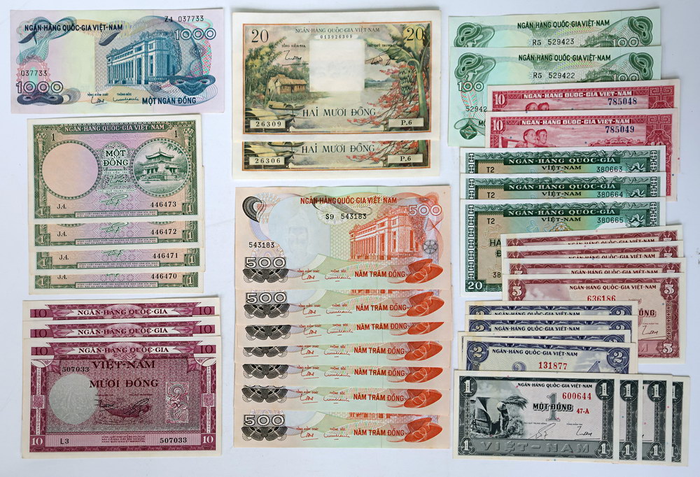 | Description: Vietnam South collection: 1000 Dong (P 29), 500 Dong (P 28a) run of 7, 100 Dong (P 26) pair, 20 Dong (P 4a) (2 notes), (P 16a) trio, 10 Dong (P 3a) trio, (P 5a) pair, 5 Dong (P 13) run of 4, 2 Dong (P 12a) run of 4, and 1 Dong (P 1a) run of 4, (P 11a) run of 4. (36 notes total). EF-UNC |