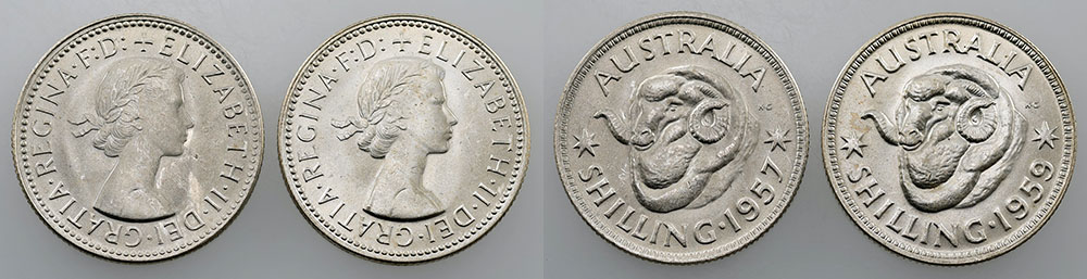 Shilling. 1957, 1958. Light tone with some...