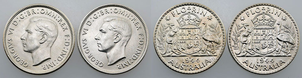 Florin. 1944S. Light tone with bloom. (2 coins...