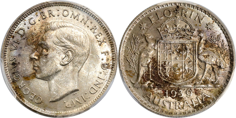 1939. Key date. PCGS graded AU 58 (42553936). Some patchy uneven brownish tone with Obverse marks.