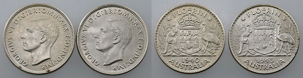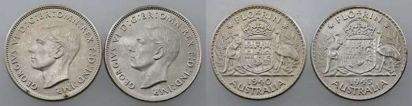 Florin. 1940, 1943. Light tone. (2 coins total).