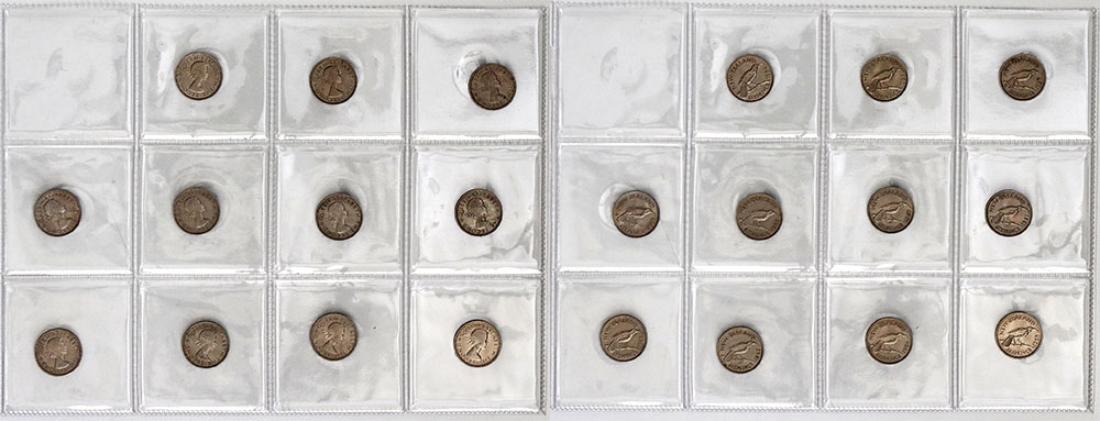 New Zealand Sixpence 1954, 1955, 1957, 1958, 1959, 1960, 1961, 1962, 1963, 1964, 1965. Light tone. (11 coins total).