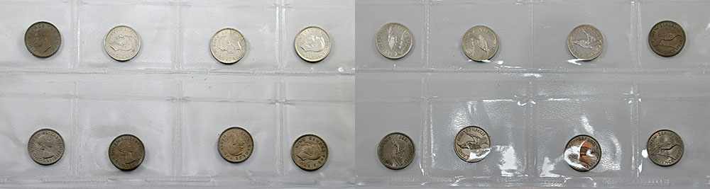 New Zealand Sixpence 1944, 1945, 1946, 1948, 1950, 1952, 1953, 1955. (8 coins total).