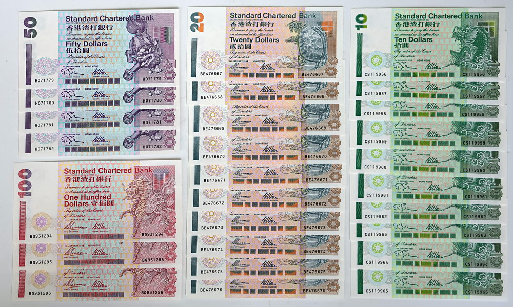 | Description: Hong Kong Standard Chartered Bank 10 Dollars (P 284) run of 10, 20 Dollars (P 285b) run of 10, 50 Dollars (P 286b) run of 4, 100 Dollars (P 287b) trio. High catalogue value. (27 notes total). aU/UNC |