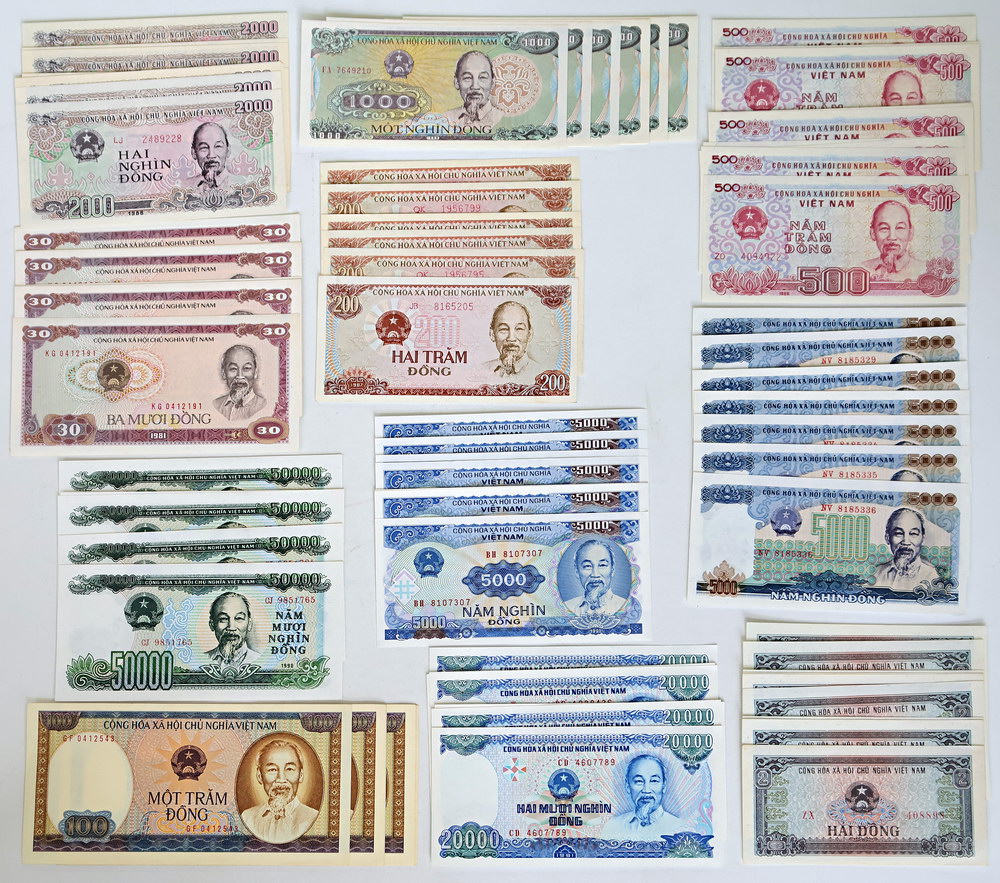 | Description: Vietnam collection, 2 Dong to 50,000 Dong 1980s. Includes: 2 Dong (P 85a) (10), 30 Dong (P 87a) (10), 100 Dong (P 88a) (10), 200 Dong (P 100a) (7), 500 Dong (P 101a) (12), 1000 Dong (P 106a) (10), 2000 Dong (P 107a) (10), 5000 Dong (P 104a) (8), 5000 Dong (P 108a) (10), 20,000 Dong (P 110a) (10) and 50,000 Dong (P 111a) (5). Light handling to some. (102 notes total). gEF-UNC |