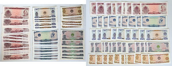 | Description: Vietnam collection, 1 Dong to 50 Dong 1976: 1 Dong (P 80a) (15), 5 Dong (P 81a) (15), 10 Dong (P 82a) (9), 20 Dong (P 83a) (12) and 50 Dong (P 84a) (29). Some handling, light stains. (80 notes total). EF-UNC |