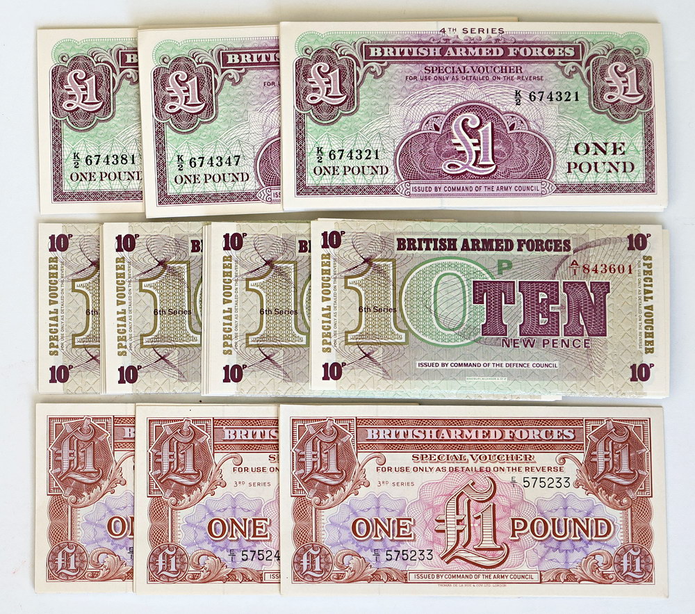| Description: Great Britain; British Armed Forces WW II Army Council issue vouchers: 1 Pound 3rd Series (P M29) (part bundle of 49), 1 Pound 4th Series (P M36a) (part bundle of 80) and 10 New Pence 6th Series (P M44) bundle of 100. (Approx 229 notes total). UNC |