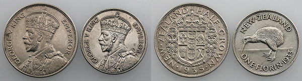 New Zealand Florin 1933, Halfcrown 1935. Light tone. (2 coins total).