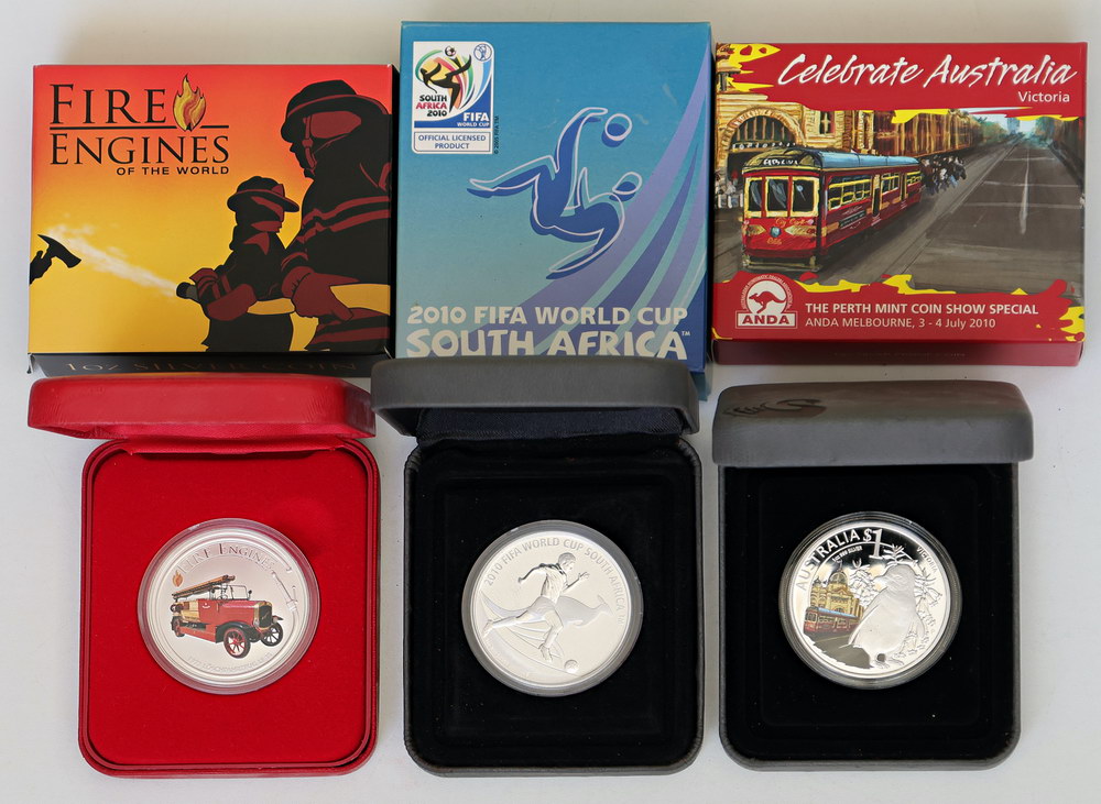 | Description: 2010 Celebrate Australia: Victoria coloured, 2010 FIFA World Cup South Africa and 2006 Fire Engines of the World: German coloured; 1 oz silver Proof issues. In boxes of issue with COA (last a little sticky). (3 items total). FDC |