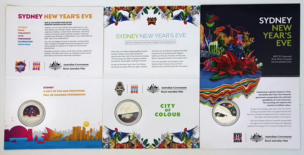 2015, 2016, 2017 Sydney NYE Fireworks coloured 1/2 oz silver Unc issues. In packs of issue. (3 items total).