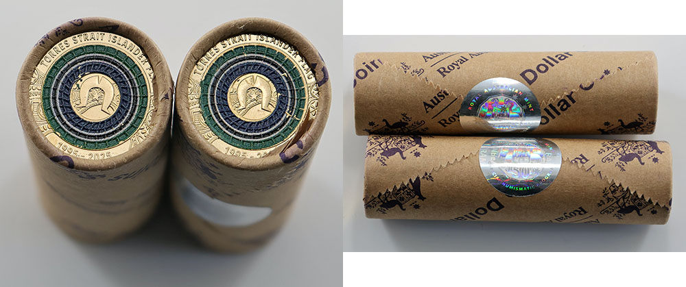 2025 Torres Strait Islander Flag coloured RAM Mint rolls of 25. Retail for $100 each. (2 rolls total).