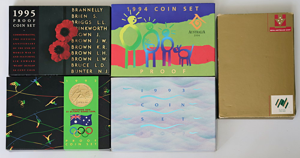 1988, 1992, 1993, 1994, 1995 Proof sets. Some marks or minor damage. (5 items total).