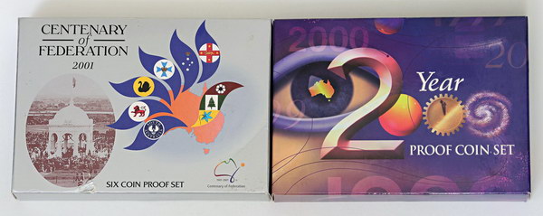 2000, 2001 Proof sets. Some marks to first, second damaged. (2 items total).