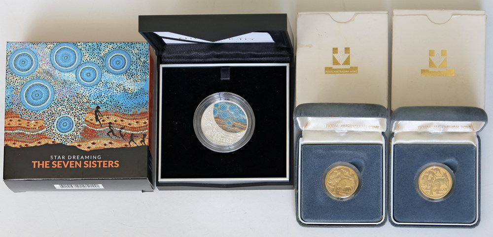 | Description: 2020 Star Dreaming: The Seven Sisters 1/2 oz coloured silver Proof. Also 1984 Proof al/br 1 Dollars (2). In cases of issue, some marks to latter two. High retail value. (3 items total). FDC |