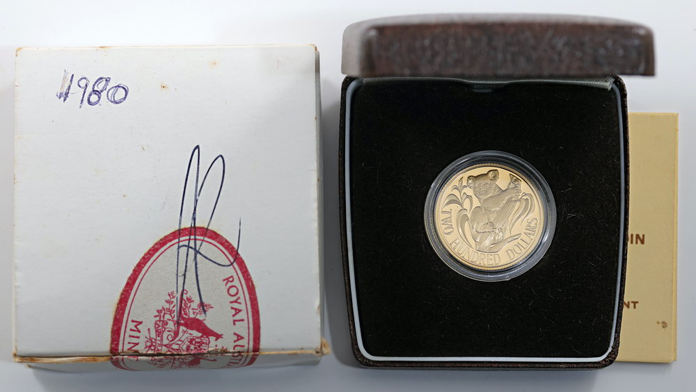 | Description: 1980 Koala gold Proof 200 Dollar (10g/22ct). In RAM case of issue with COA and outer box (marks and light damage to box). FDC |