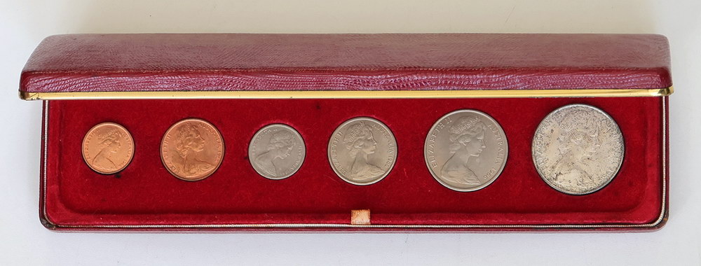 | Description: 1966 Mint set in dated RAM red hinged case; Inscribed on inner lid -Australian Decimal Coins - 14th February 1966-. Some tone, stains to inner case. Scarce. UNC |