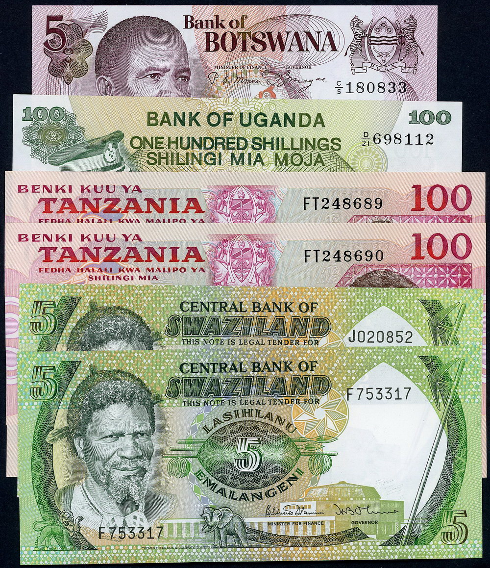 | Description: Botswana 5 Pula 1982 (P 8a), Swaziland 5 Emalangeni 1984 (P 9b) (2), Tanzania 100 Shillingi 1977 (P 8b) consecutive pair and Uganda 100 Shillings 1973 (P 9c). (6 notes total). UNC |