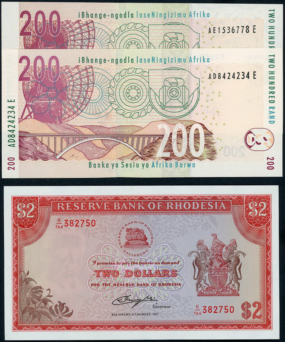 Rhodesia 2 Dollars 1977 (P 35c) Last date for type and South Africa 200 Rand 2005 (P 132) (2) slight handling, paper depression. (3 notes total).