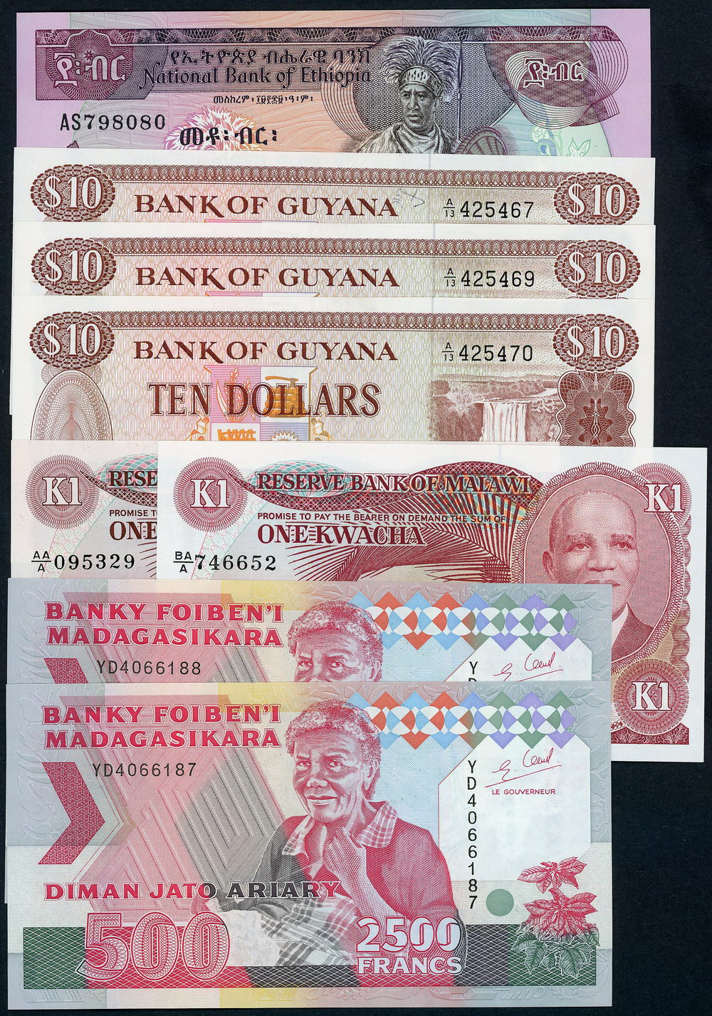 | Description: Ethiopia 100 Birr (P 40) Arms A, Guyana 10 Dollar (P 23c) (2), Malawi 1 Kwacha 1978 (P 14b), 1981 (P 14d), Madagascar 2500 Franc = 500 Aviary 1993 (P 72Ab) consecutive pair. (7 notes total). UNC |