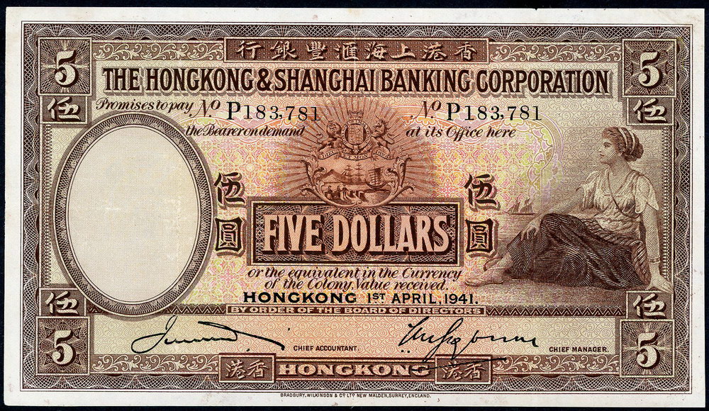 Hong Kong and Shanghai Banking Corp 5 Dollars 1-4-1941 (P 173d). Three folds and an edge nick, but scarce.