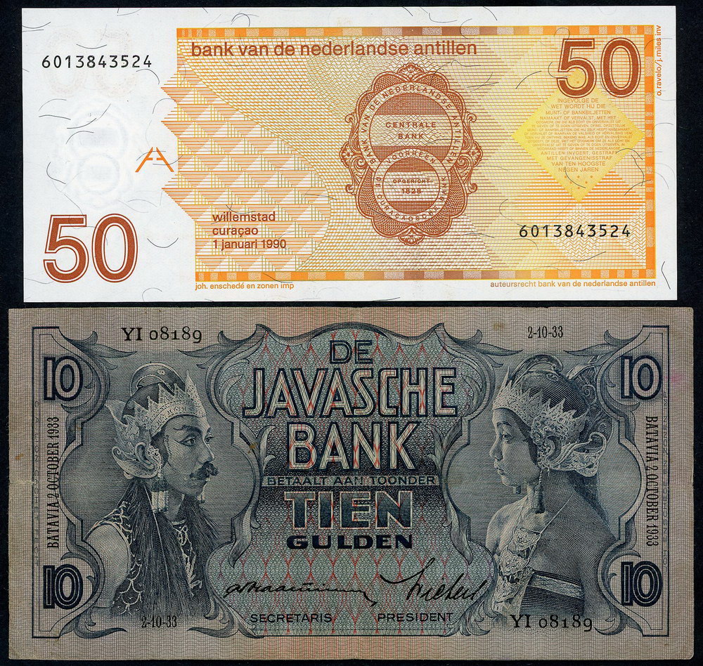 Netherlands Antilles 50 Gulden 1990 (P 25b) (Unc) and Netherlands Indies 10 Gulden 1933 (P 79a) (gFine, tear). (2 notes total).