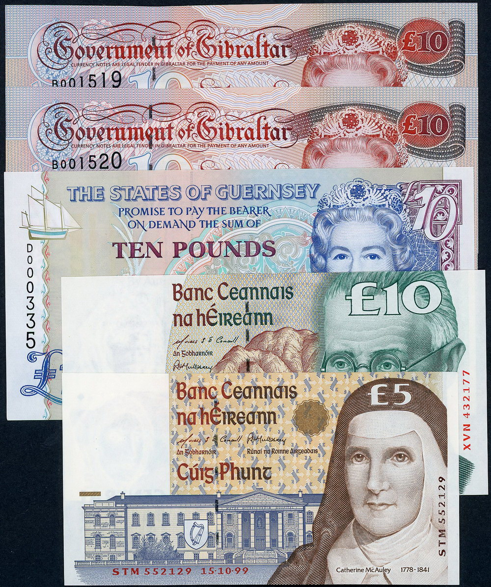 Gibraltar 10 Pounds 2002 (P 30) consecutive pair, Guernsey 10 Pounds 1995 Clark (P 57b), Ireland 5 Pound 1999 (P 75b) and 10 Pound 1999 (P 76b). (5 notes total).