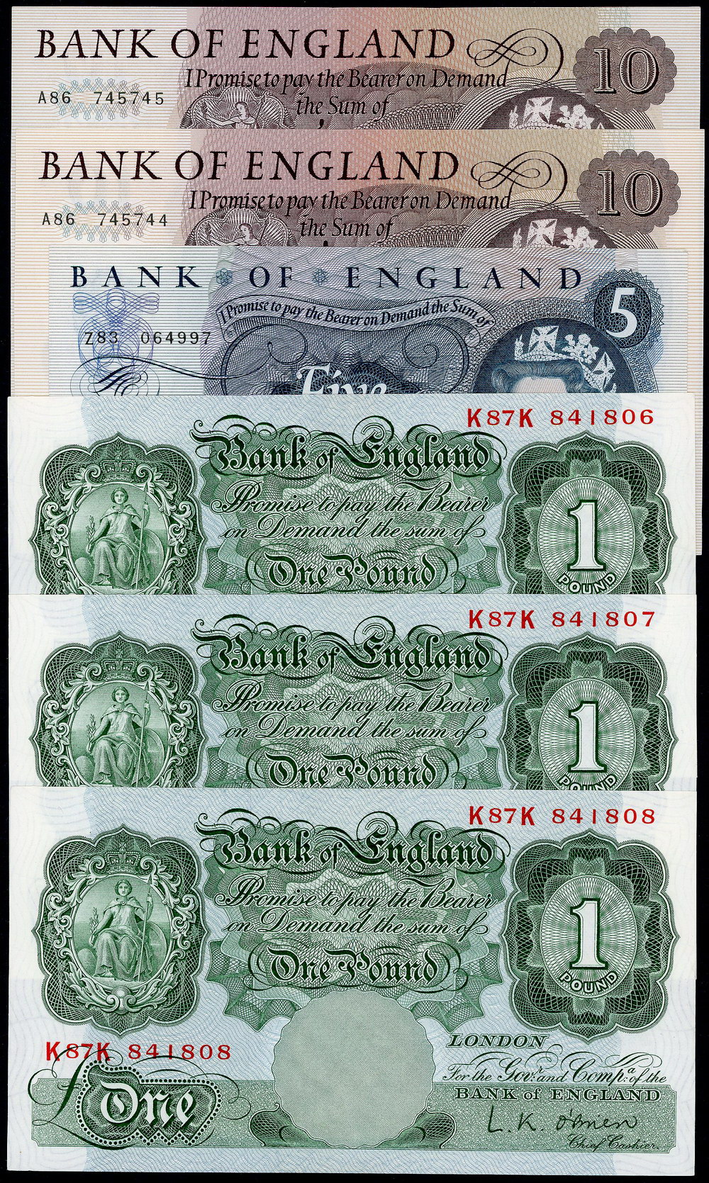 | Description: Great Britain 1 Pounds N/D (1955-60) (P 369c) with security thread (consecutive trio), 5 Pound N/D (1966-70) Fforde (P 375b) and 10 Pounds N/D 1966-70 Fforde (P 376b) consecutive pair (light fold, flicks). (6 notes total). aEF-UNC |