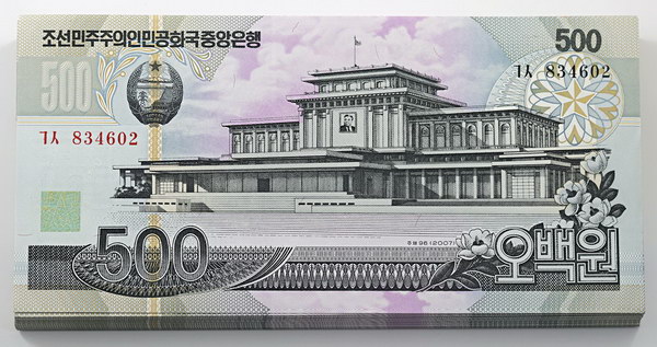 North Korea 500 Won 2007 (P 44c). Part-bundle of approx 85. Catalogue at $12.50 USD each.