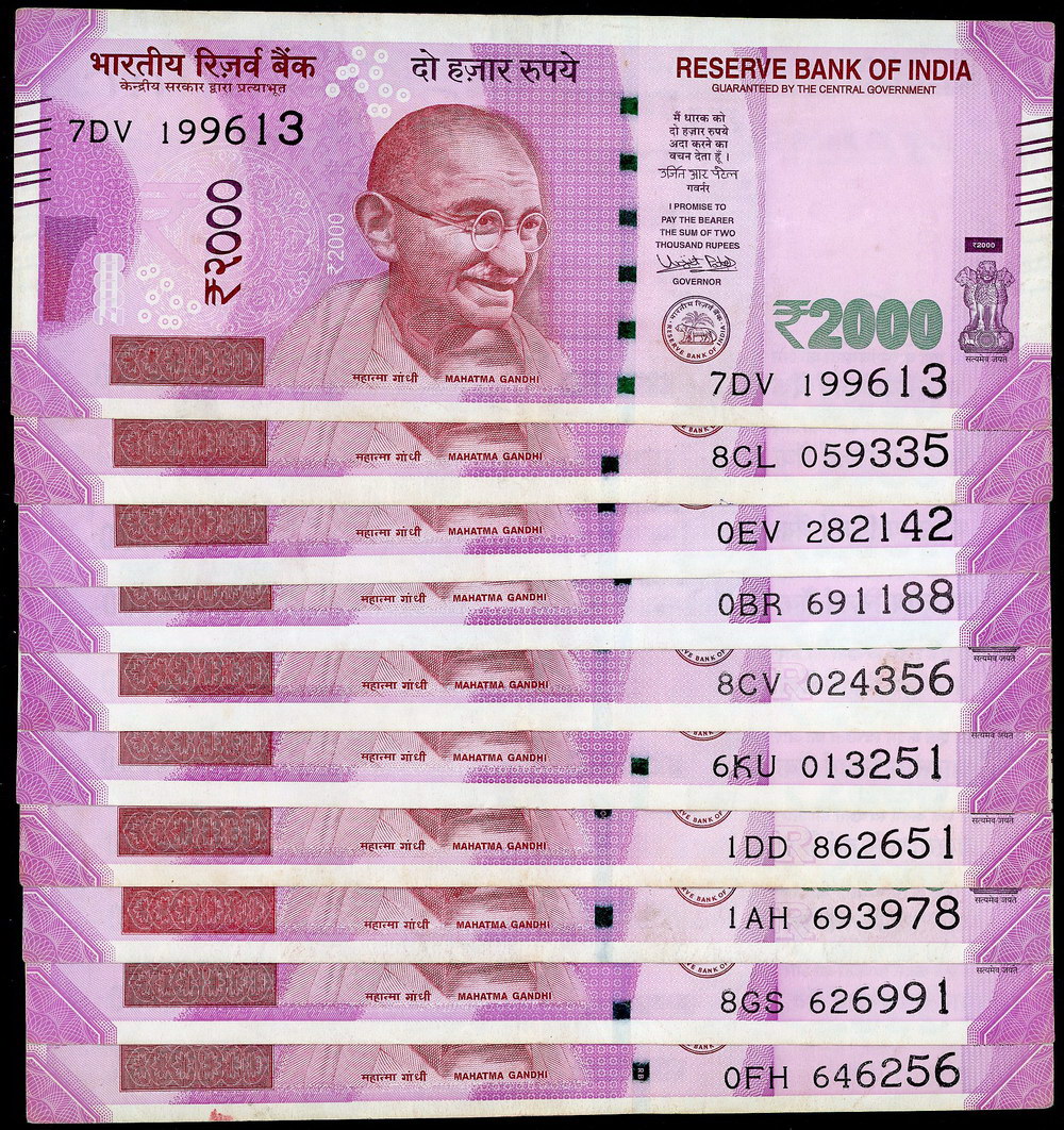 India 2000 Rupees 2016 (P 116a). (10 notes total).