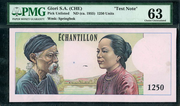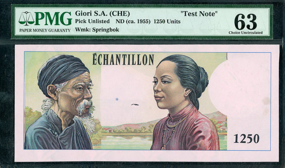 | Description: South Vietnam National Bank of Viet Nam Giori S.A. (Che) Echantillon Test Note for 1250 Units N/D (c 1955) (P Unlisted). PMG graded 63 Ch Unc. The Old Man and Temple design type of (P 4a) is easily South Vietnams most coveted design type with renowned aesthetics. The face of this Giori test note shows the Old Man on the face facing the young woman from the back of the finalised design. |