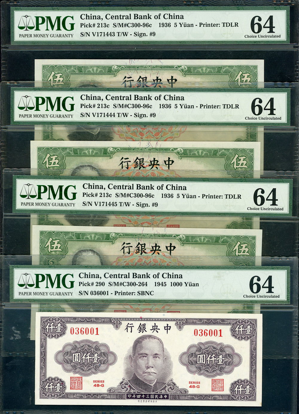 China Central Bank 5 Yuan 1936 (P 213c) consecutive trio and 1000 Yuan 1945 (P 290). All PMG graded 64 Choice Unc. (4 notes total).
