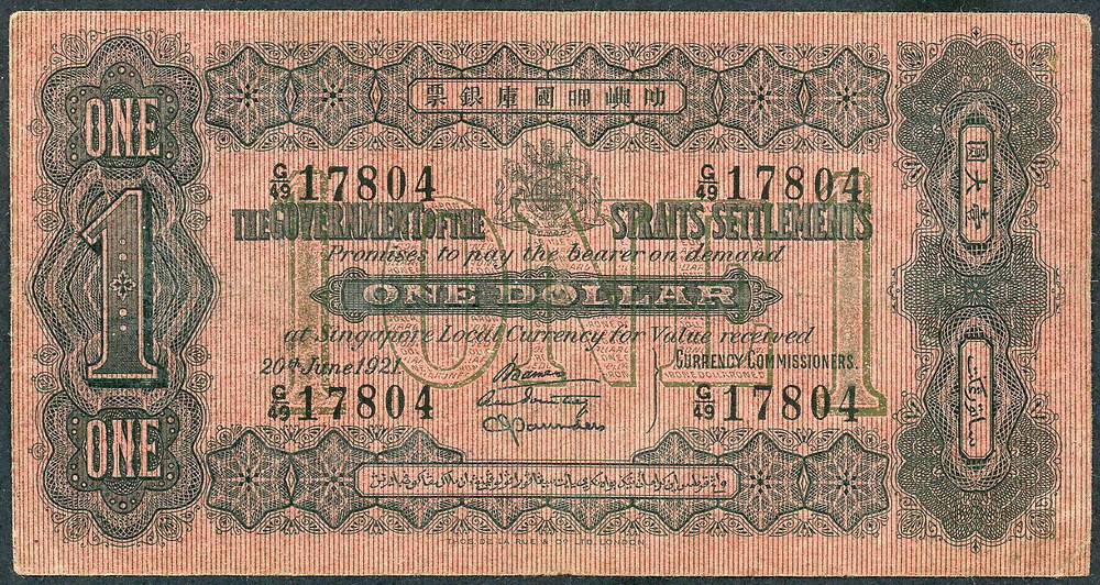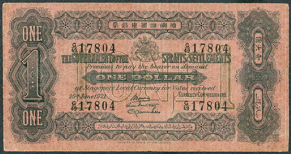 | Description: Straits Settlements Government 1 Dollar 20-6-1921 (P 1c). Printed on dark pink paper. Two pin holes, old folds. Rare. aVF |