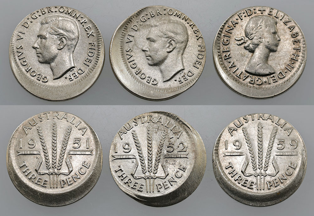 1951, 1952, 1959. All struck off centre approx 3mm with partially raised rim lips. (3 coins total).