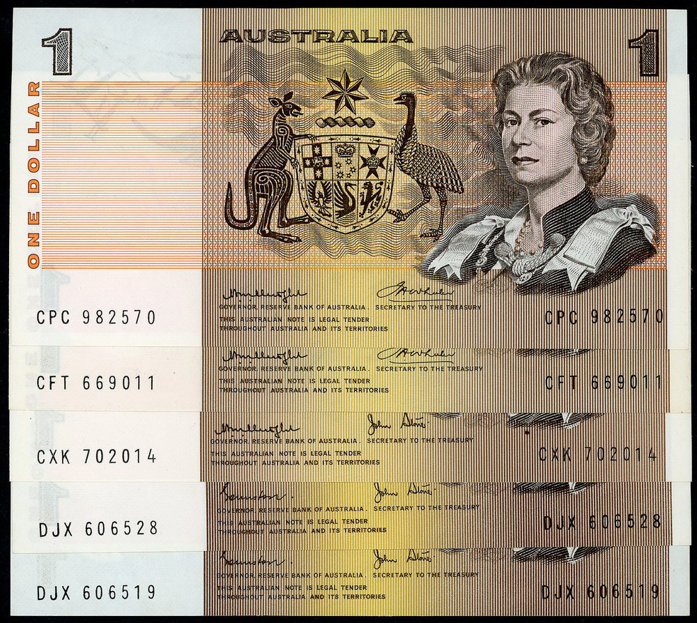 1976 Knight-Wheeler (R 76a) centre thread, (R 76c) side thread, 1979 Knight-Stone (R 77), 1982 Johnston-Stone (R 78) (2). (5 notes total).