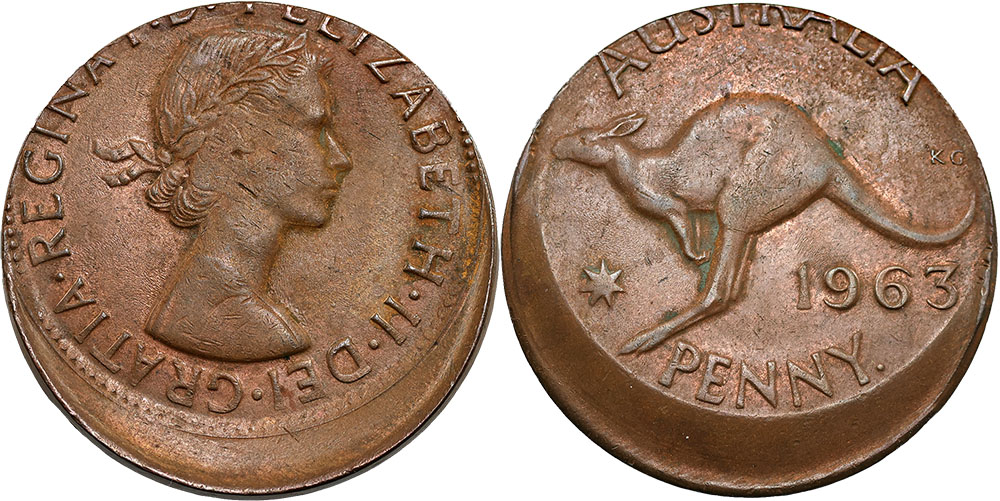 1963Y. Struck approx 4.5mm off-centre with slightly raised rim lip. Brown with slight traces of red.
