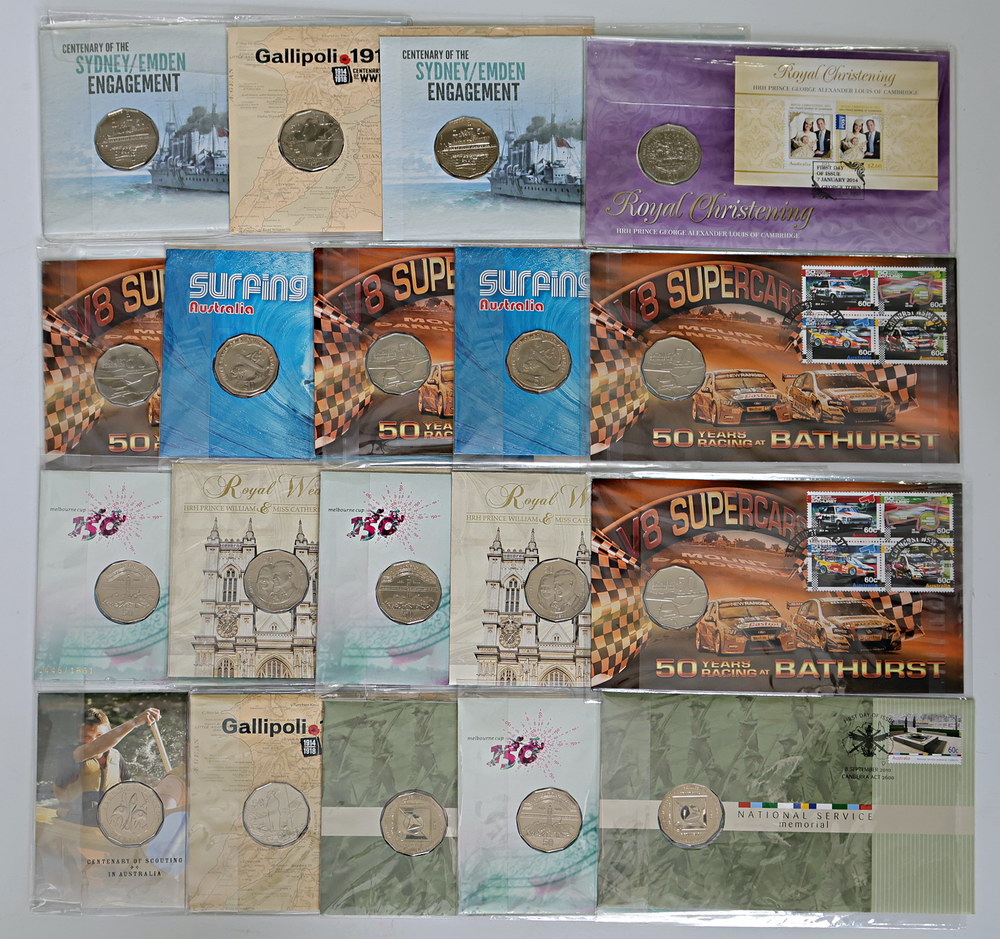 | Description: 2008-2015 assorted First Day Covers: 2008 Scouting, 2010 National Service (2), Melbourne Cup (3), 2011 Royal Wedding (2), 2013 Bathurst (4), Surfing (2), 2014 Christening, Sydney Emden (2) and Gallipoli (2). High catalogue value. (19 items total). UNC |