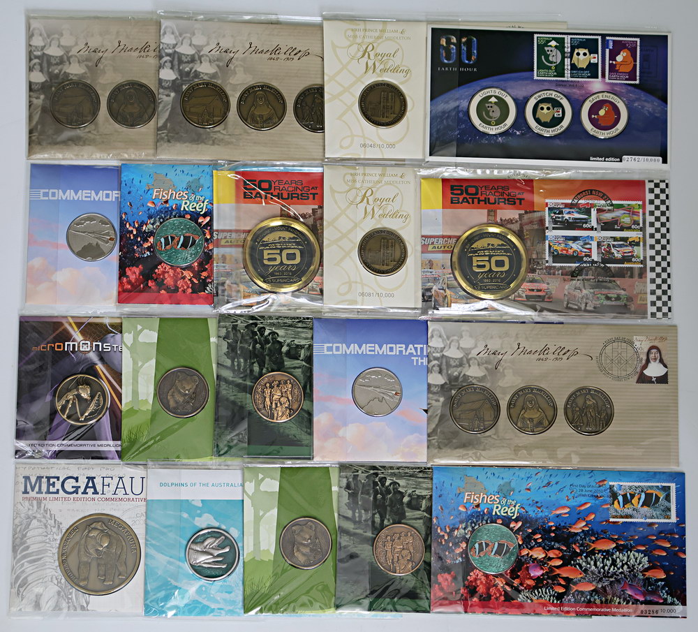 | Description: Medallic First Day Covers: 2008 Mega Fauna, 2009 Micro Monsters Praying Mantis, Earth Hour coloured 3-medallion issue, Dolphins coloured, 2010 Koala (2), Mary MacKillop 3-medallion issue (3), Kokoda (2), Fishes of the Reef coloured (2), 2011 F-111 (2), Royal Wedding (2) and Bathurst 50 Years (2). (19 items total). UNC |