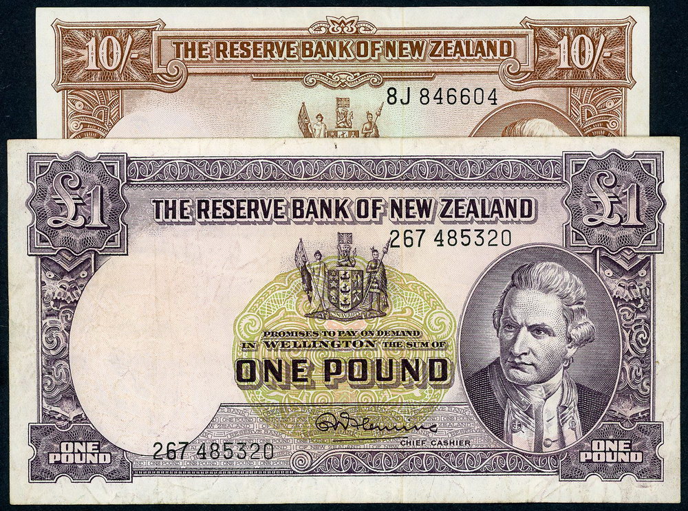 New Zealand 10 Shillings and 1 Pound Fleming (P 158d) and (P 159d). Folds, handling, the latter more worn with four pinholes. (2 notes total).