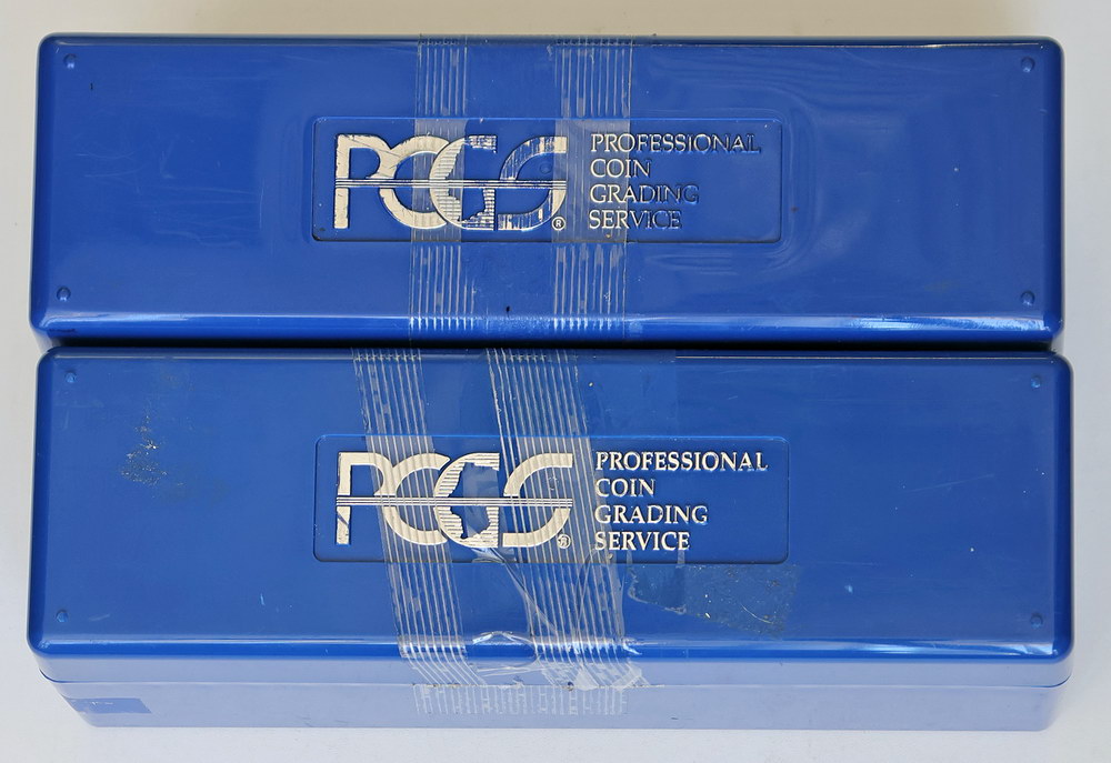 PCGS storage boxes; holds 20 slabbed coins each. Old tape/stickers. (2 items total).
