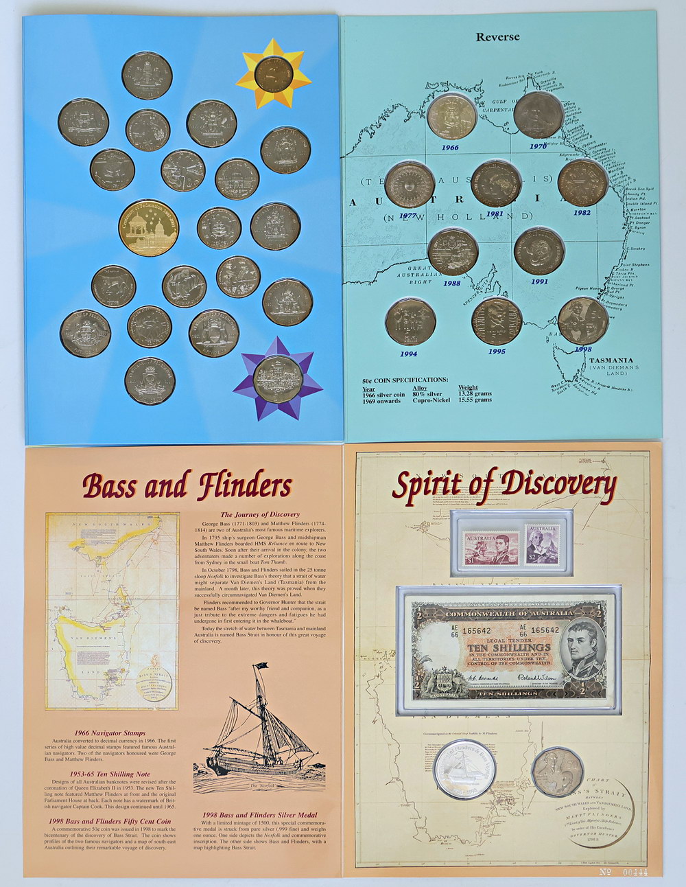 | Description: 1998 Bass and Flinders 10 Shilling note, 2 coin and stamp collector portfolio, 50 Cent Commemorative Coin Collection of 10 coins including 1966 Round and 2001 Centenary of Federation 20 Cent to 1 Dollar 20-coin and silver medallion collection in folder (limited edition no 00046). In folders by Sherwoods. (3 items total). UNC-FDC |
