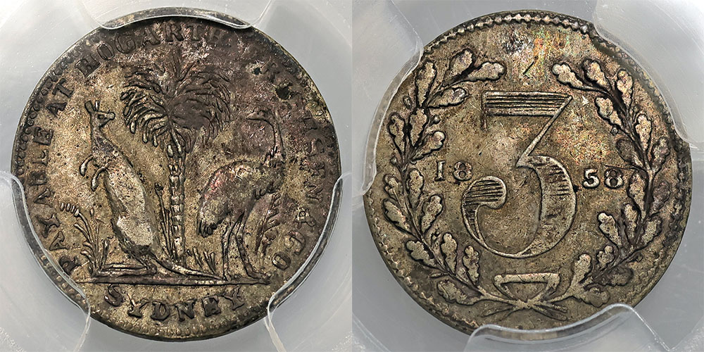 | Description: Hogarth, Erichson and Co Sydney NSW 1858 (R 253/A 688) silver Threepence token. Dark toned, Rarity 8. PCGS graded AU 50 (49752645). Pop 1 and the only example graded. Rare this grade. Ex Noonans UK Oct 2023 (lot 1004) (since graded). gEF/aUNC |