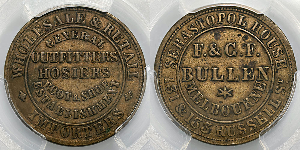 | Description: Bullen, F and G.F, Melbourne Vic N/D (1858) (R 62) brass Halfpenny token/check piece. Light brown, Rarity 6. PCGS graded XF 45 (49752643). Pop 1 and the only example graded. Rare this grade. Ex Noonans Oct 2023 (lot 1037) (since graded). aEF |
