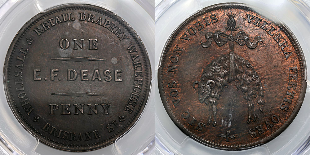 | Description: Dease, E.F, Launceston Tas N/D (1865) (R 107/A 99) copper Penny token. Dark brown with traces of lustre, Rarity 4. PCGS graded MS 61 BN (49752642). Second highest graded with only two higher. Rare this grade. Ex Noonans Oct 2023 (lot 1030) (since graded). UNC |
