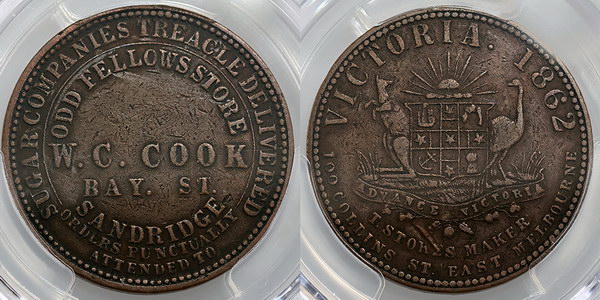 | Description: Cook, W.C, Sandridge Vic 1862 (R 84/A 75) copper Penny token. Dark brown, Rarity 6. PCGS graded VF 35 (49752638). Pop 1 and the only example graded. Ex Noonans UK Oct 2023 (lot 1059) (since graded). aVF |