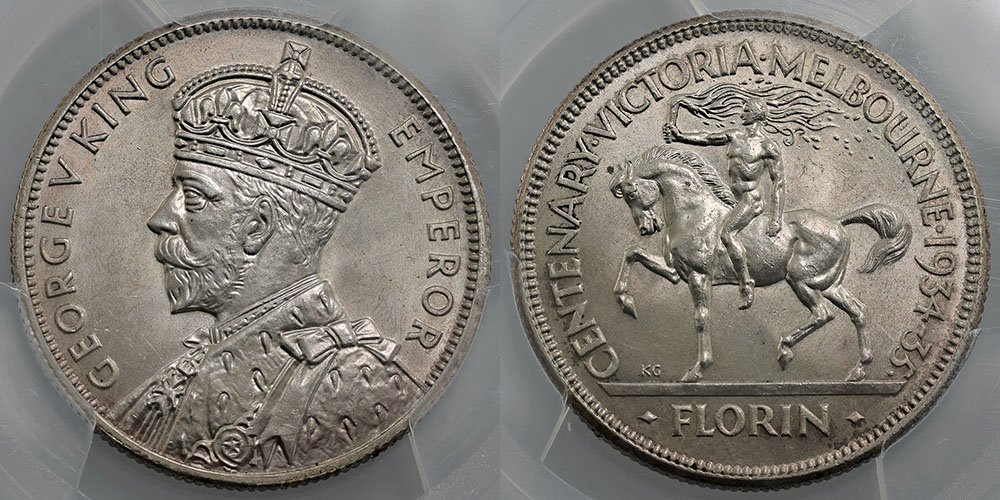 | Description: 1934/35 Melbourne Centenary. PCGS graded MS 65+ (46533096). Light tone with lustre, part wreath. GEM UNC |