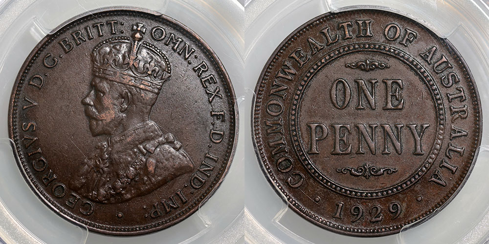 1929. English Obverse. PCGS graded AU 53 (80763057). Dark brown.